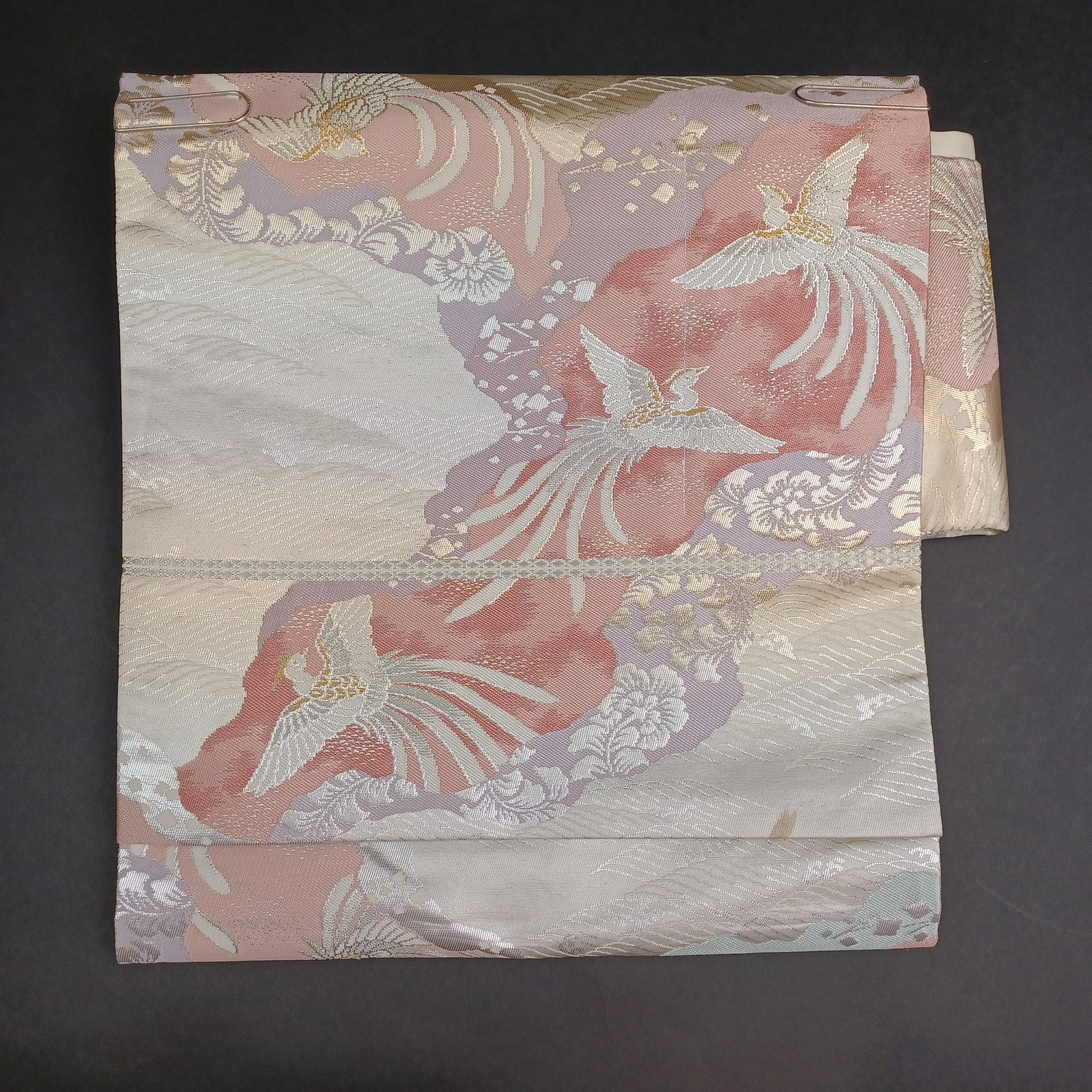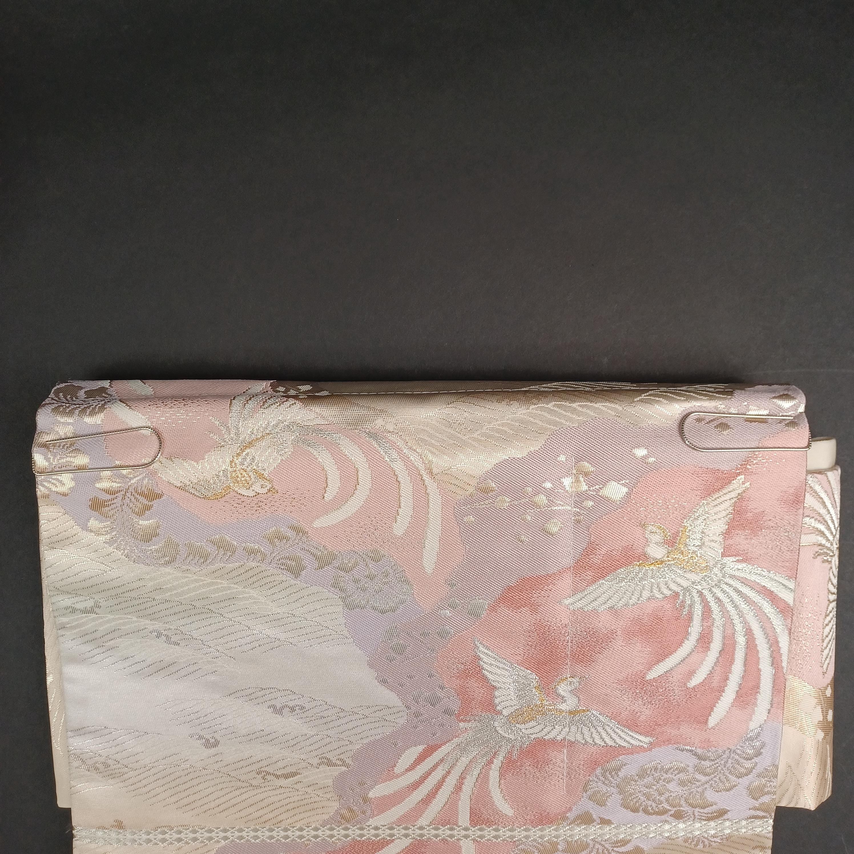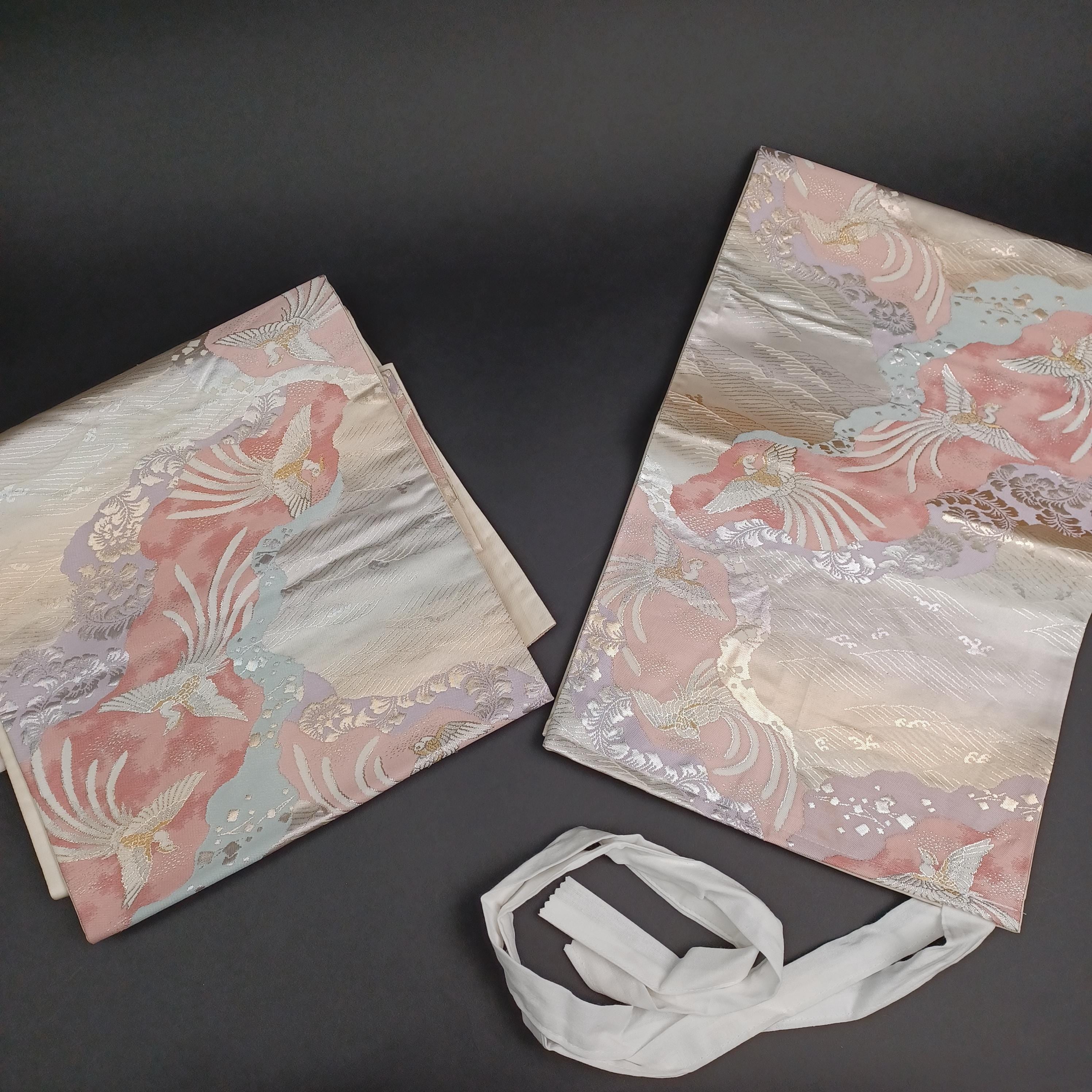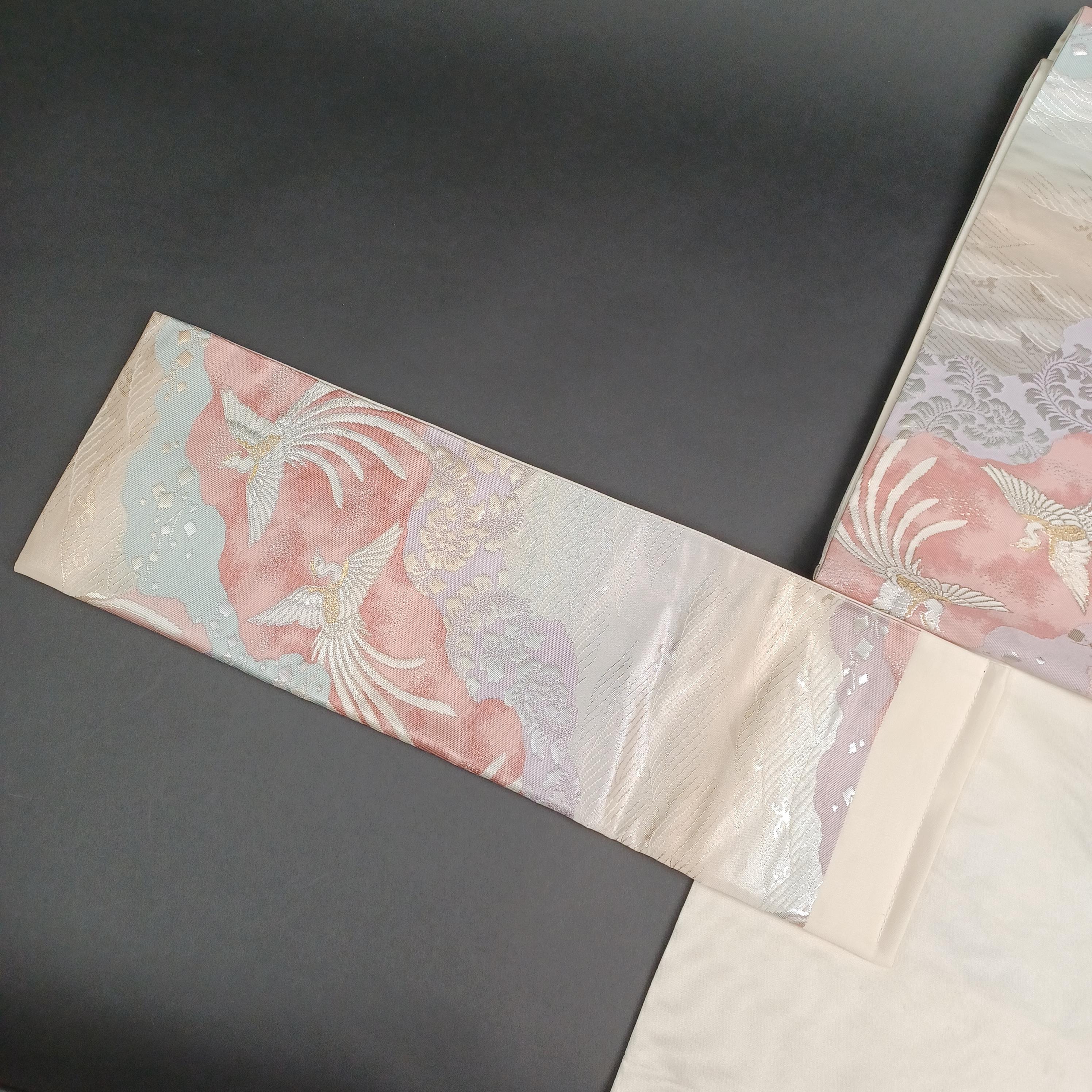 What makes this particular "Tsukuri Obi" special is its width. At 11.8 in (30 cm), the sash is as wide as a formal "Fukuro Obi" or "Nagoya Obi." This is a highly unusual and rare feature for a pre-tied obi! While the original creator's intention is unknown, you can wear it as is or fold it in half as you would a regular obi to achieve a traditional look. ✨