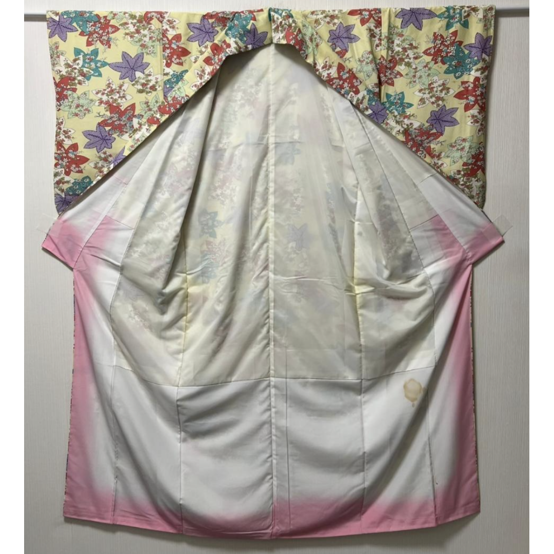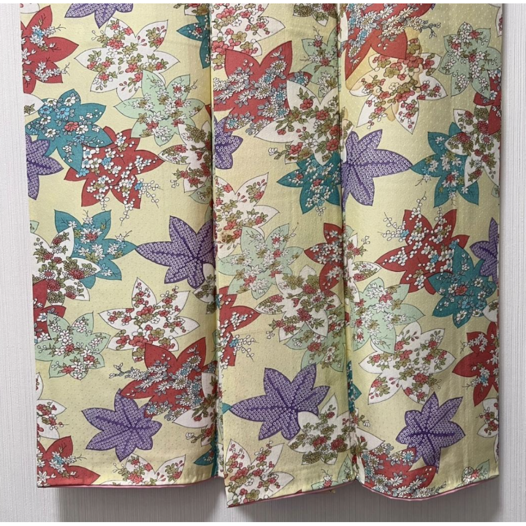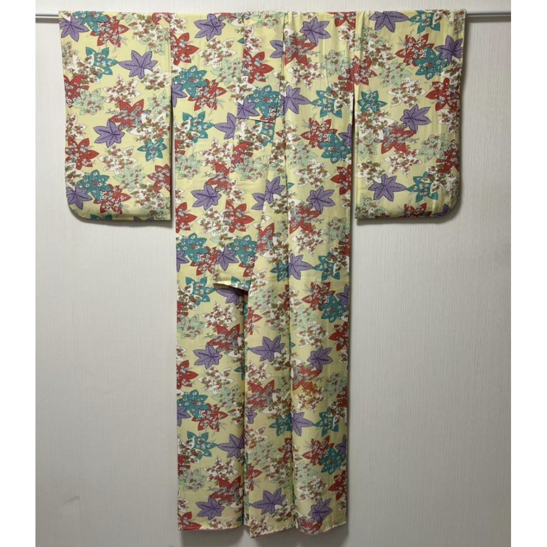 Used Japanese Washable Kimono Komon Pale Yellow Polyester with Autumn Maple Leaves Pattern Traditional Casual Wear for Women Made in Japan