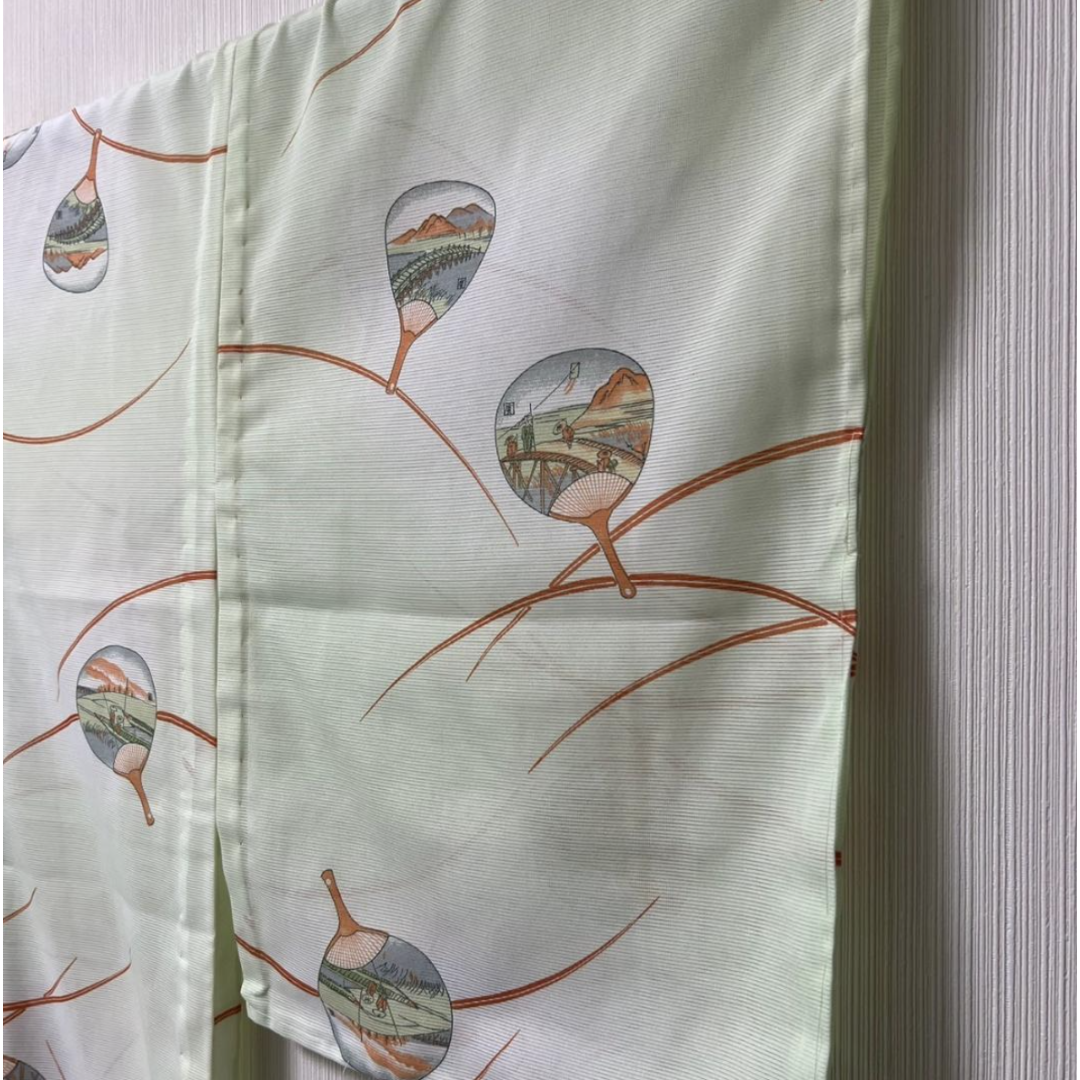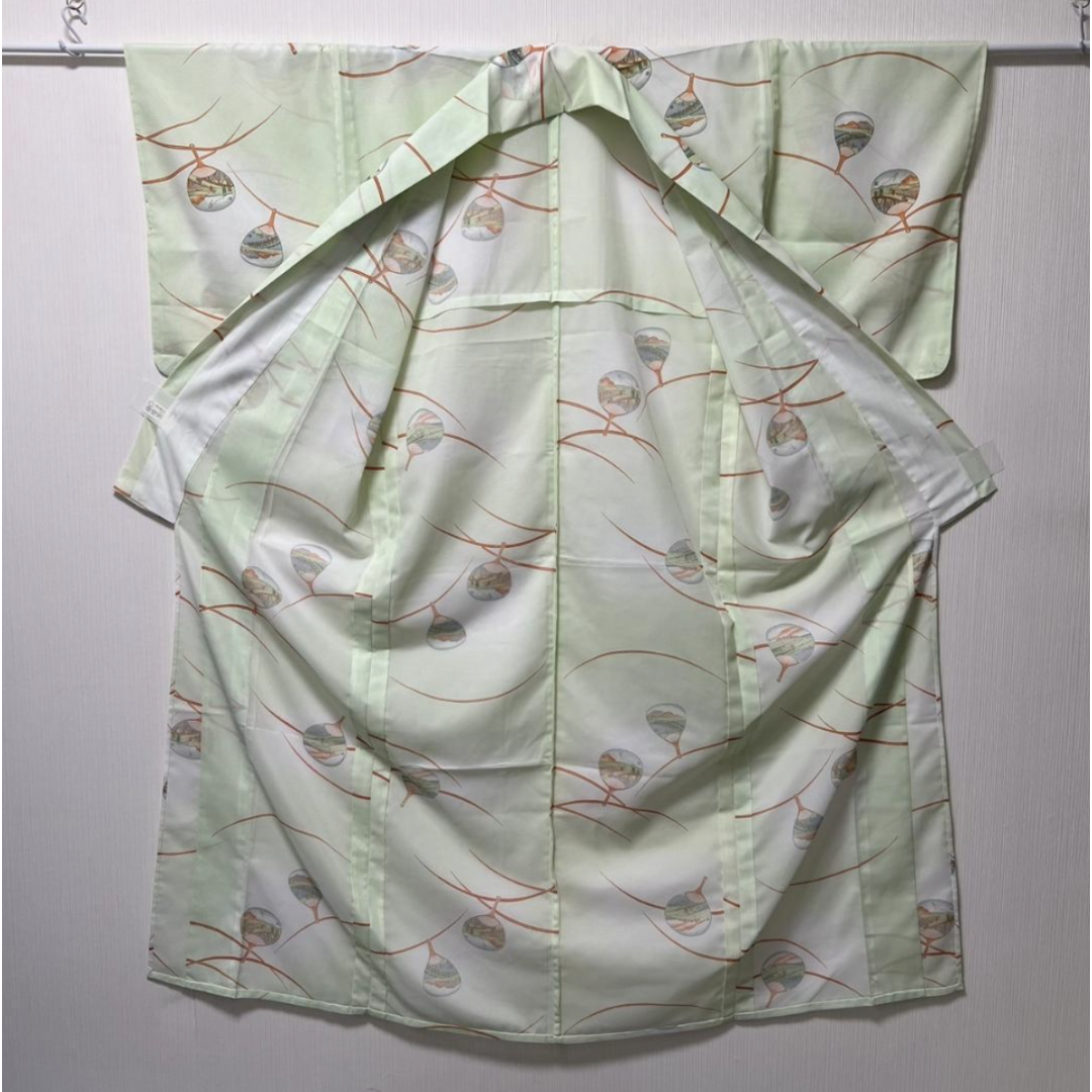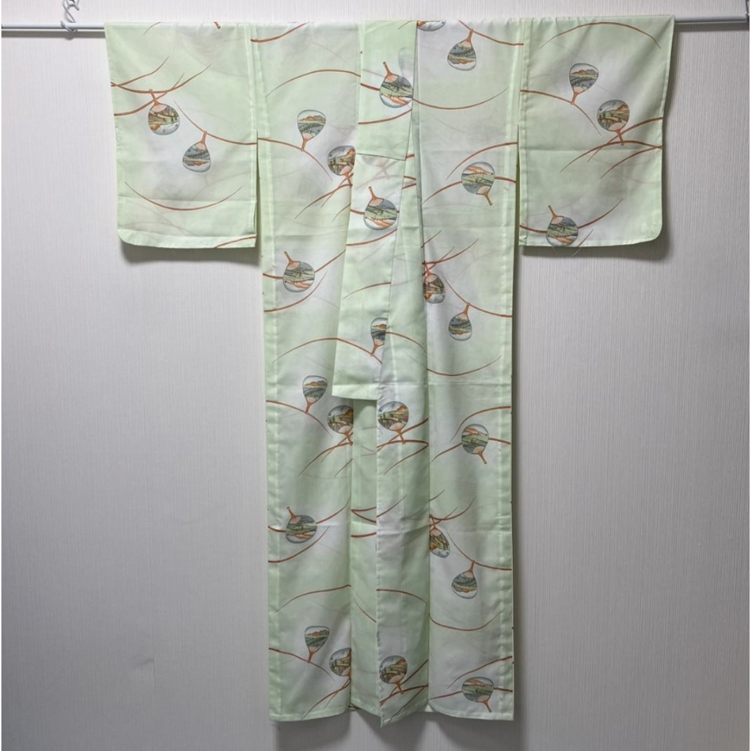This is a beautiful "Ro" style summer kimono, characterized by its horizontal mesh-like weave that provides excellent breathability for hot weather. This "Komon" features a refreshing design with traditional "Uchiwa" (Japanese round fans), making it an ideal choice for summer festivals, tea ceremonies, or casual outings.