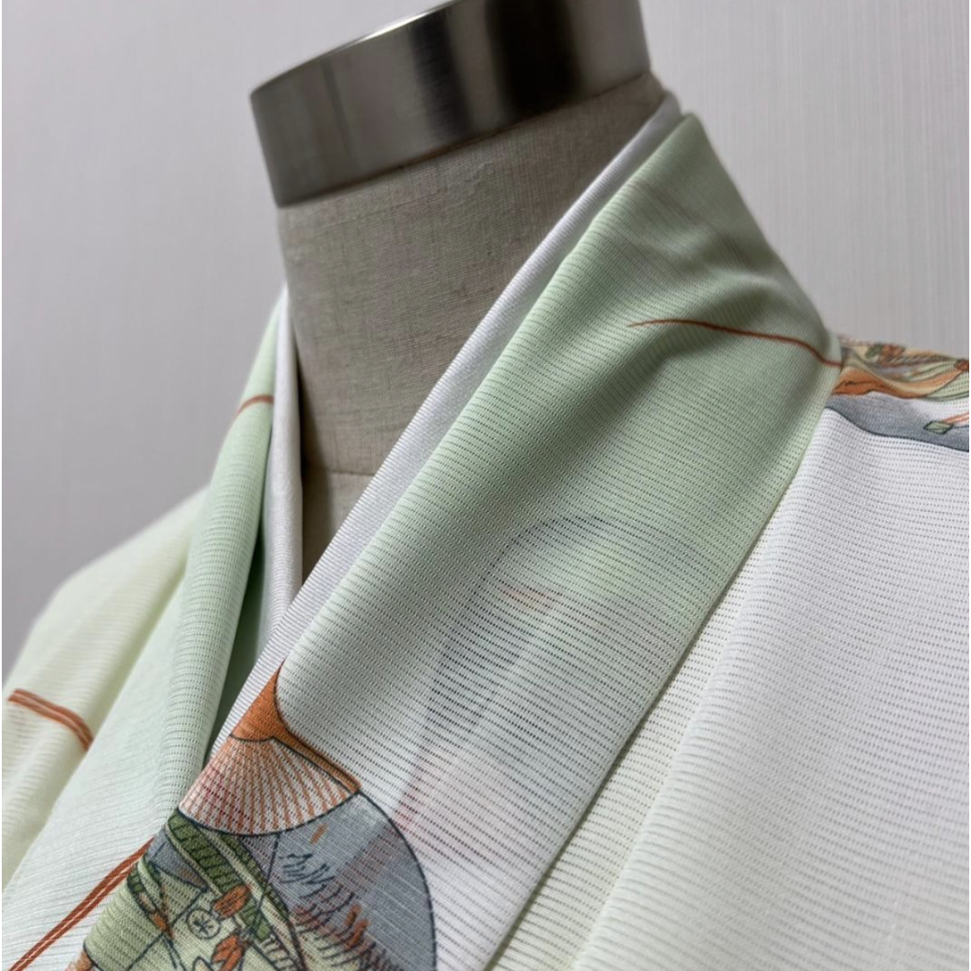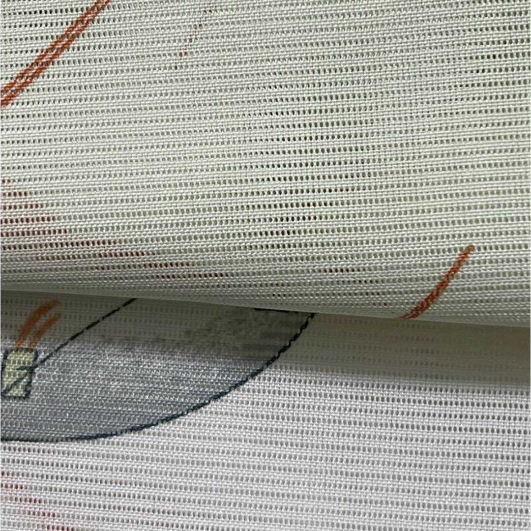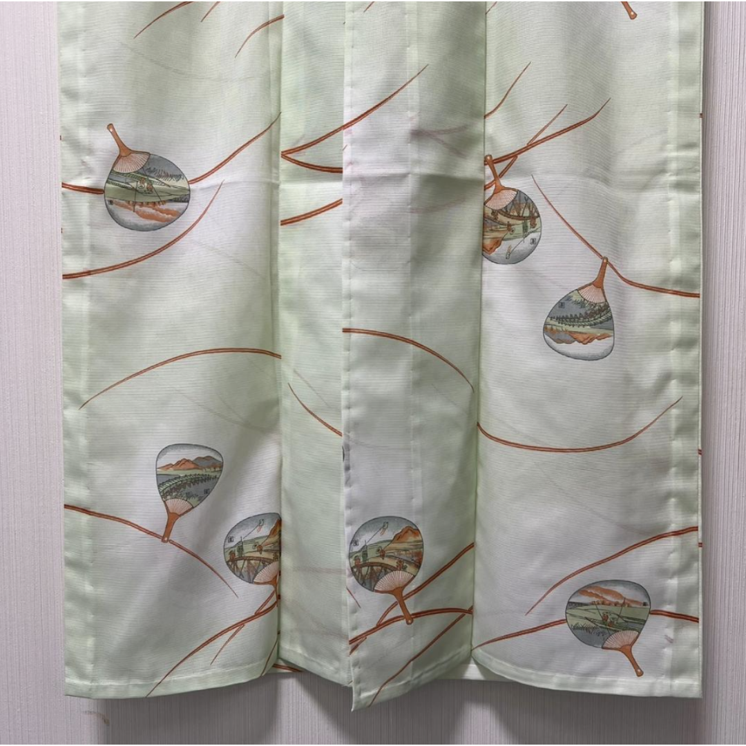 This is a beautiful "Ro" style summer kimono, characterized by its horizontal mesh-like weave that provides excellent breathability for hot weather. This "Komon" features a refreshing design with traditional "Uchiwa" (Japanese round fans), making it an ideal choice for summer festivals, tea ceremonies, or casual outings.