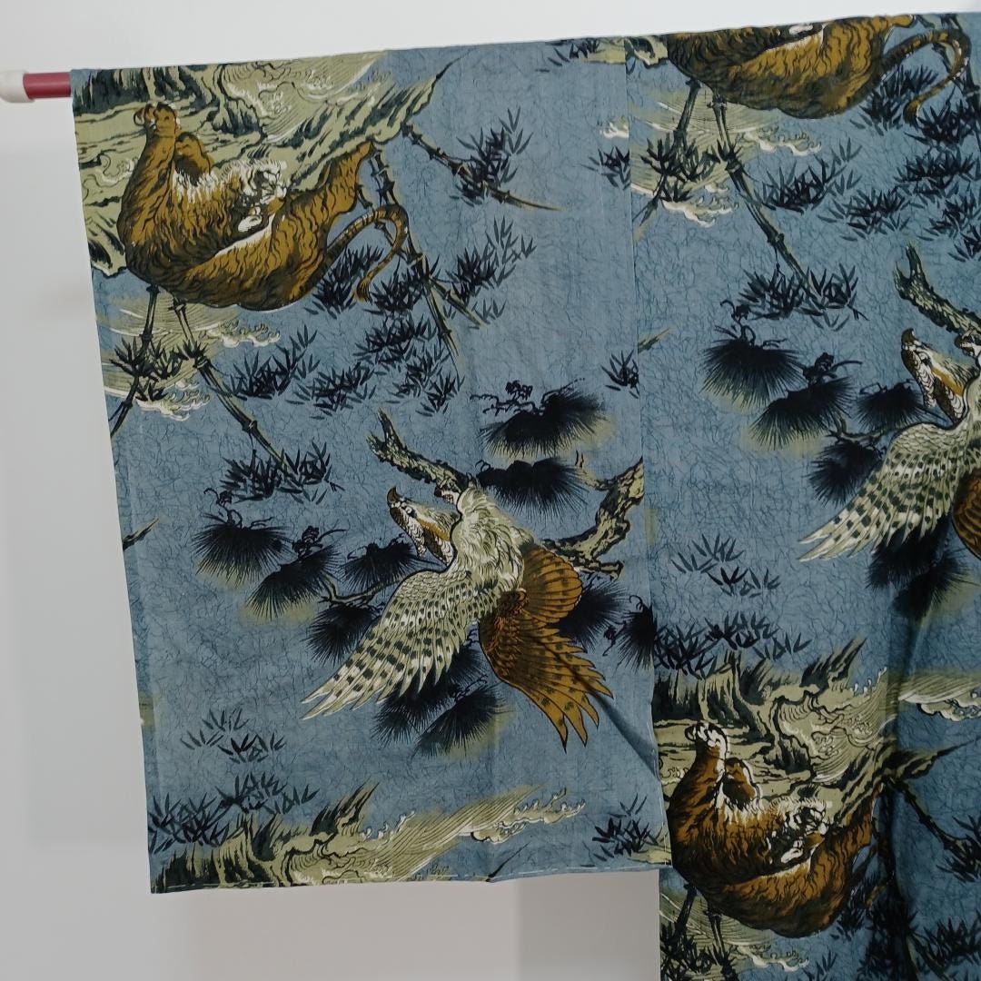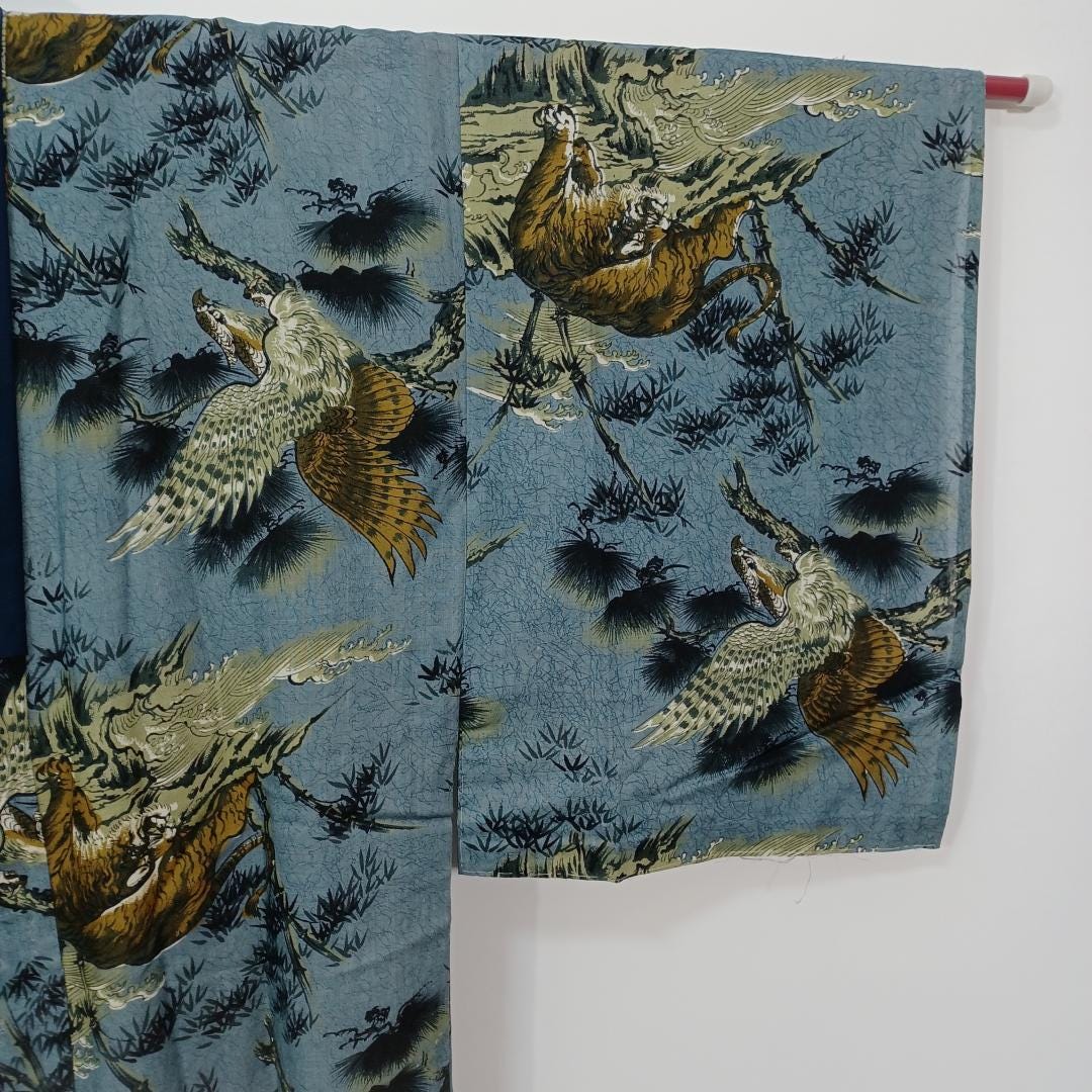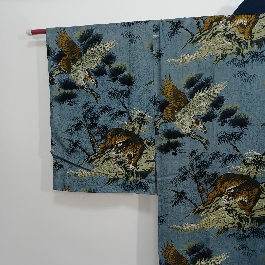 Used Men's Kimono Juban Blue Tiger Eagle Cotton Japanese traditional kimono underwear