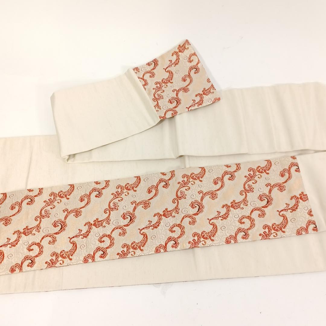 This is a beautiful vintage Nagoya Obi, a traditional Japanese sash used for kimono. It features a refined white base adorned with an elegant pattern, offering a clean and sophisticated look that pairs well with various kimono styles.