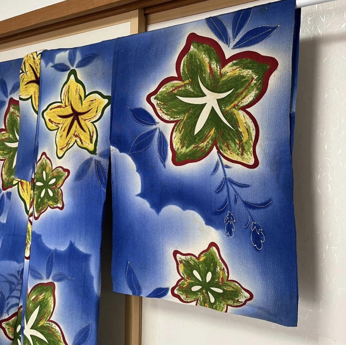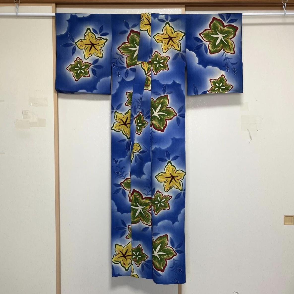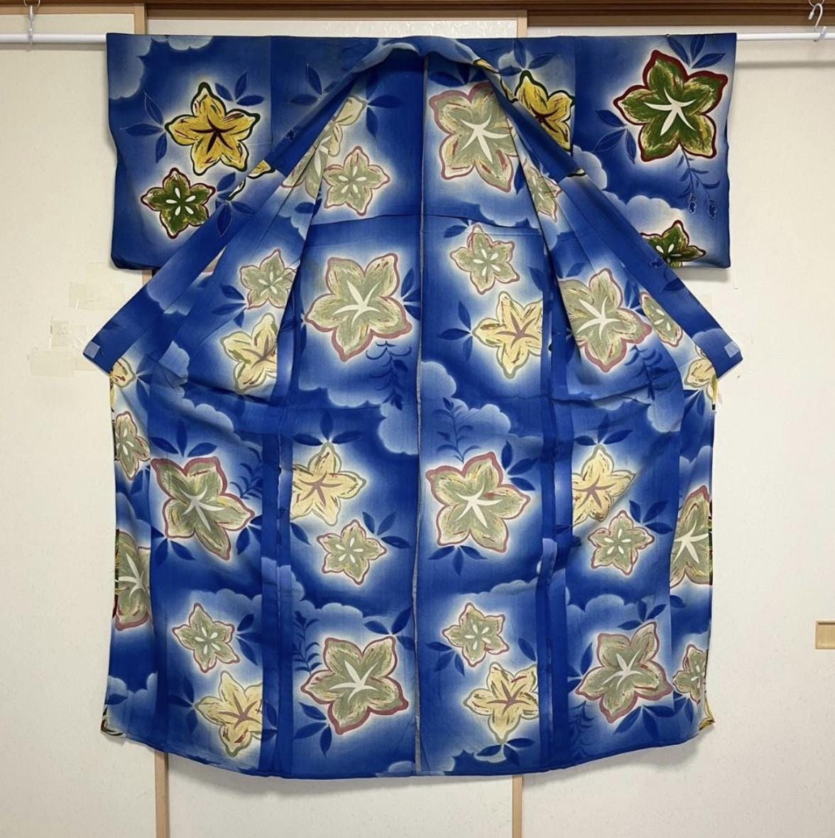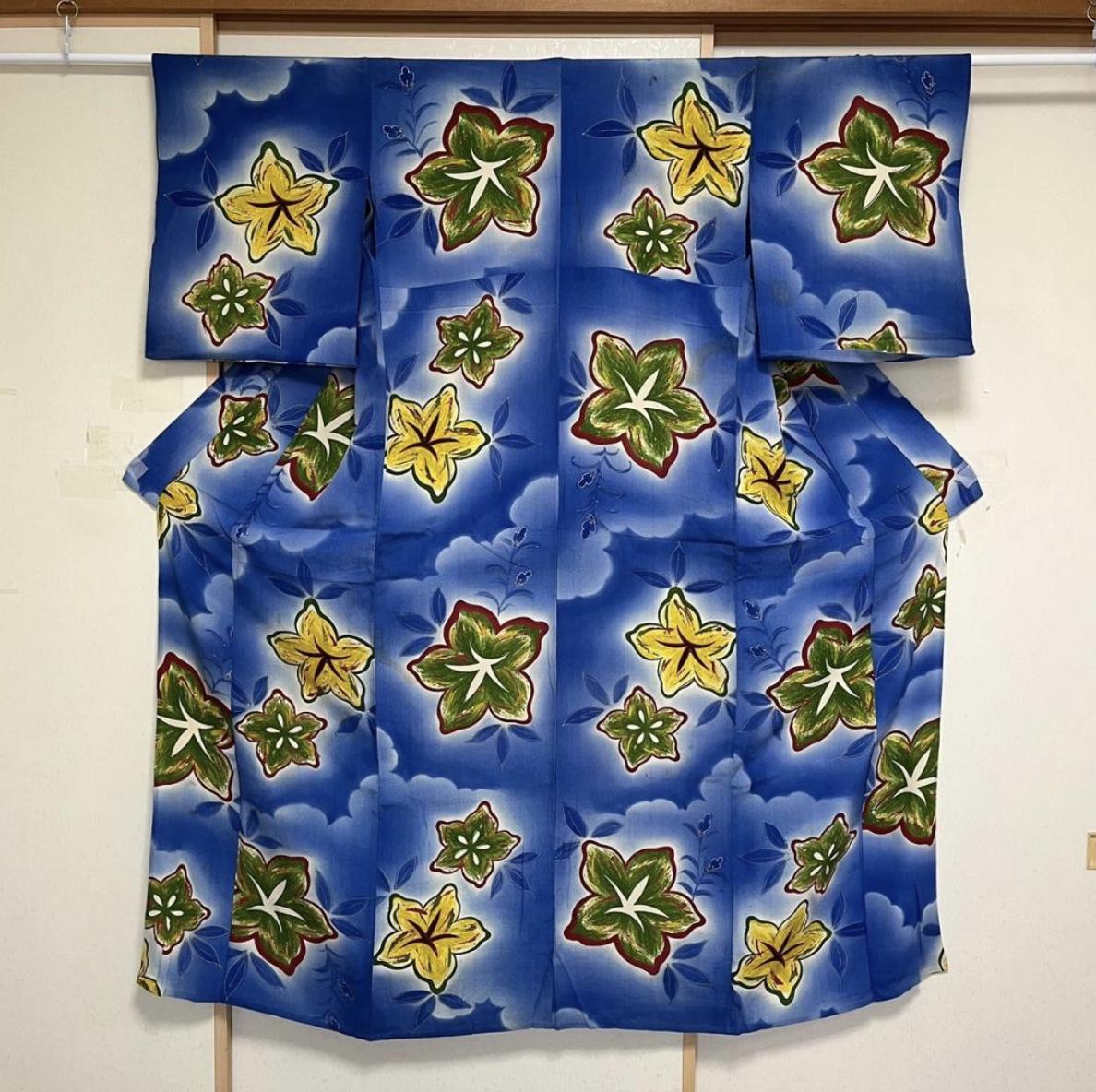 This is a used antique summer kimono (omeshi) featuring a beautiful and rare pattern of star-like flowers and clouds on a serene blue background. The single-layer (hitoe) silk fabric is perfect for warmer weather. ☀️